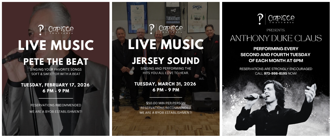 Anthony brings oldies to life, creating the perfect ambiance for a relaxing and memorable evening. As a reminder, we are a BYOB establishment; we invite you to bring your own to pair with our refined Italian menu!